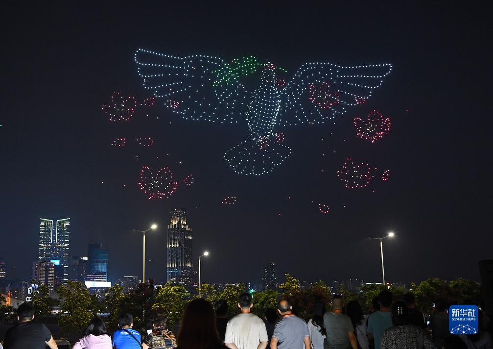 9月30日,无人机在维港上空拼成和平鸽造型。新华社记者 陈铎摄