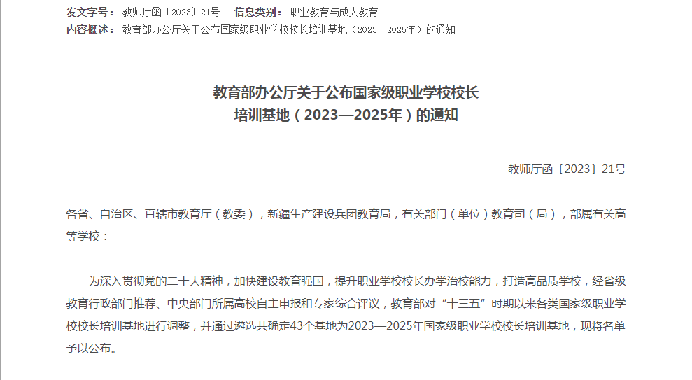 为提升职业学校校长办学治校能力,教育部对“十三五”时期以来各类国家级职业学校校长培训基地进行调整,并通过遴选共确定43个基地为2023—2025年国家级职业学校校长培训基地。教育部近日印发通知,对名单予以公布。