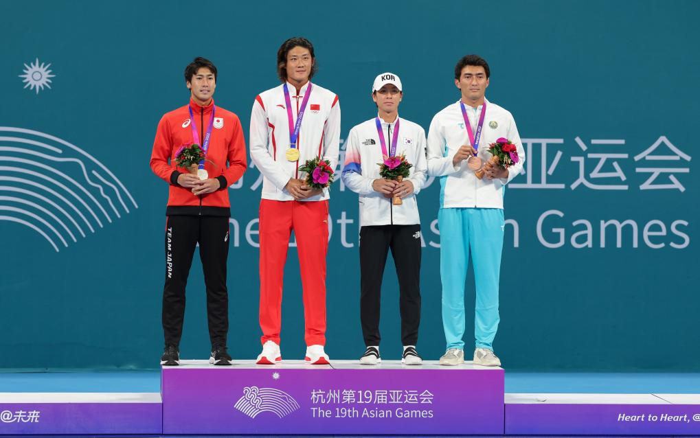9月30日,冠军中国选手张之臻(左二)、亚军日本选手绵贯阳介(左一)、季军韩国选手洪性赞(右二)和乌兹别克斯坦选手胡莫云·苏丹诺夫在颁奖仪式上合影。新华社记者 孟晨光 摄