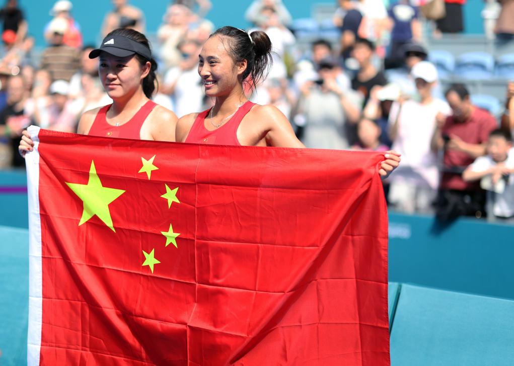 9月29日,郑钦文(右)在比赛后与朱琳庆祝胜利。新华社记者 贾浩成 摄