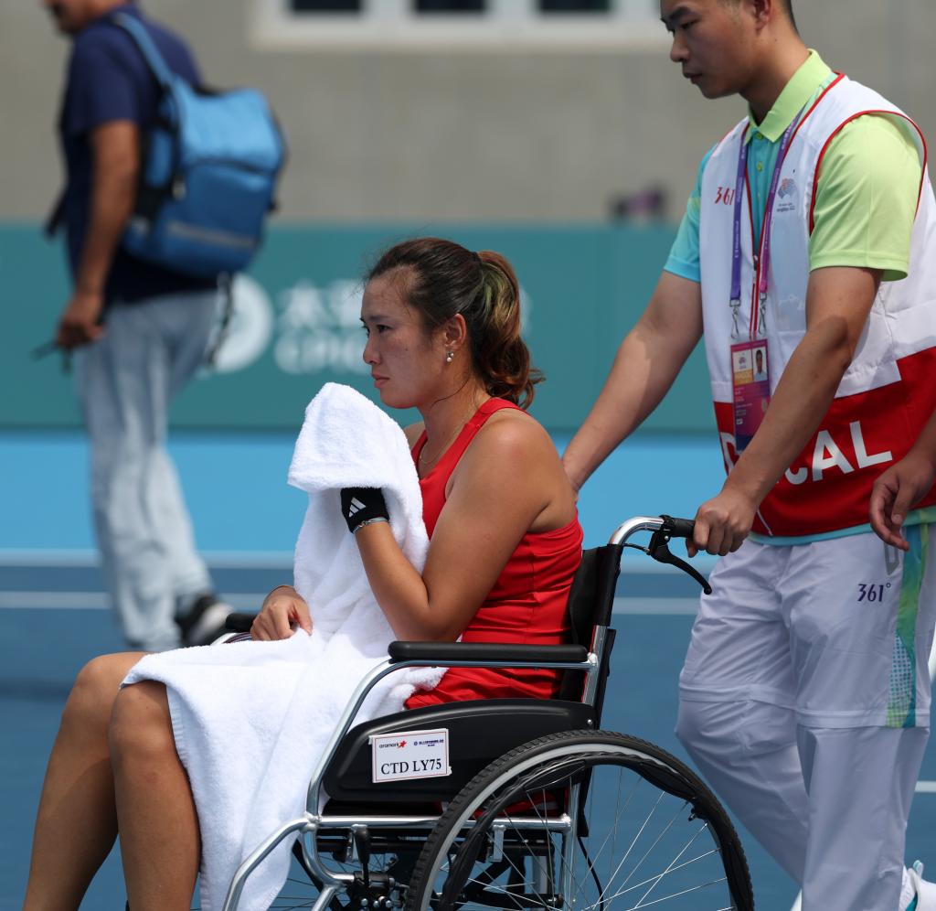 9月26日,杨钊煊坐在轮椅上离开赛场。新华社记者 孟晨光 摄