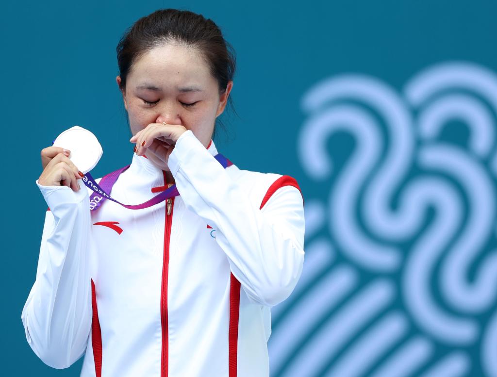 9月29日,亚军中国选手朱琳在颁奖仪式上落泪。新华社记者 贾浩成 摄