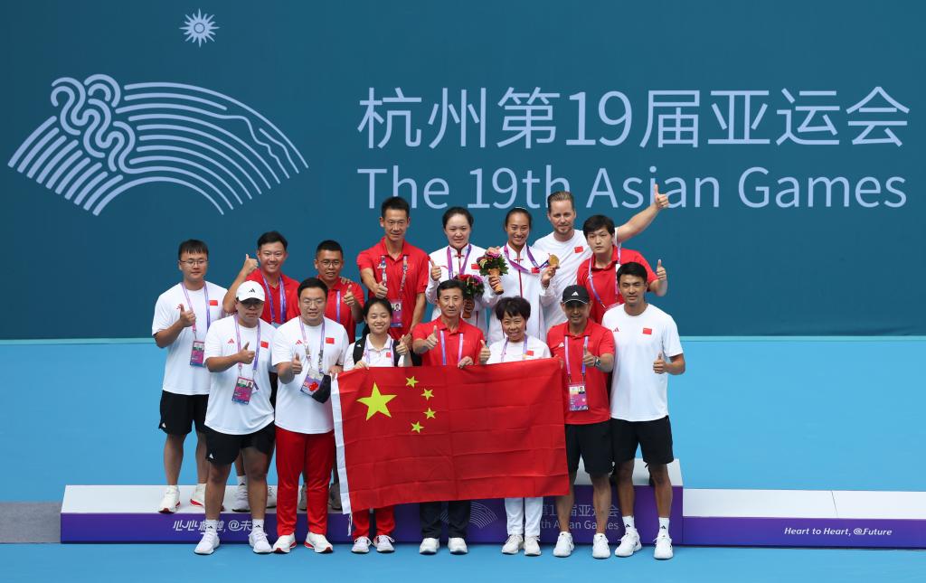9月29日,中国网球队成员在颁奖仪式后合影。新华社记者 孟晨光 摄