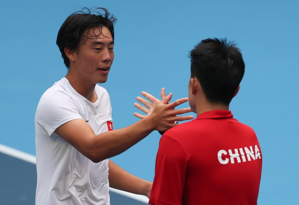 9月26日,黄泽林(左)与吴易昺在赛后握手。当日,在杭州亚运会网球项目男子单打第三轮比赛中,中国选手吴易昺以1:2不敌中国香港选手黄泽林,无缘八强。新华社记者 孟晨光 摄