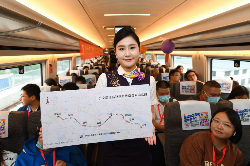 9月28日,乘务员在首发的G7799次列车上展示线路走向示意图。新华社记者 季春鹏 摄