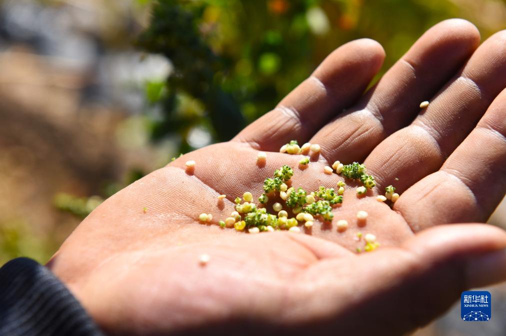 10月1日,在沽源县白土窑乡小西沟村,当地农户展示手搓后的成熟藜麦粒。