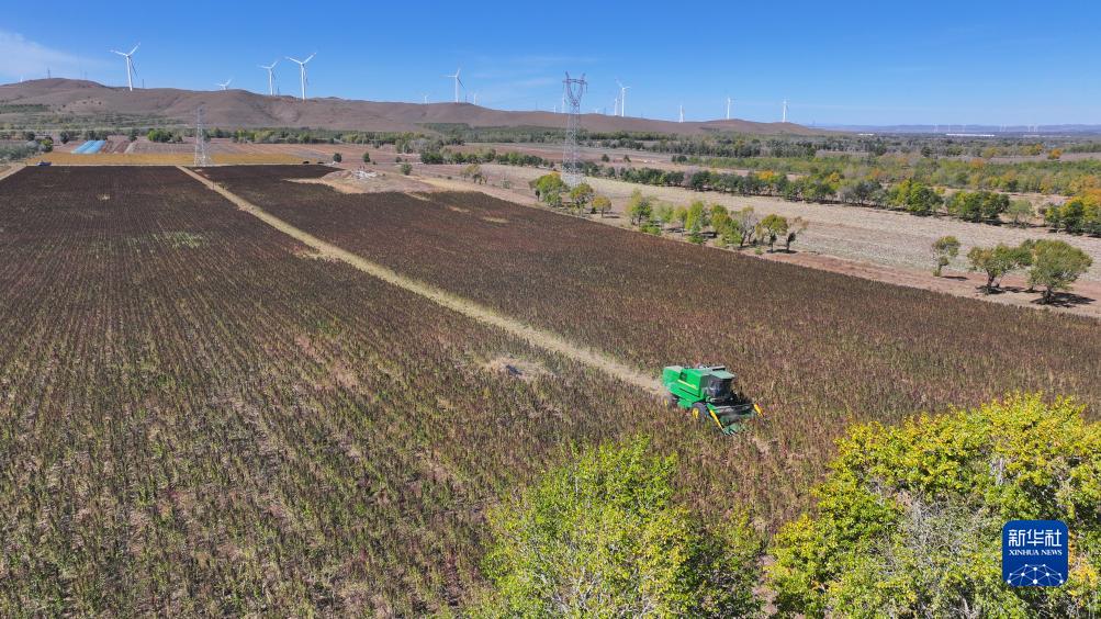 10月1日,在沽源县白土窑乡小西沟村,当地农机手正在田间操作收割机收获藜麦(无人机照片)。