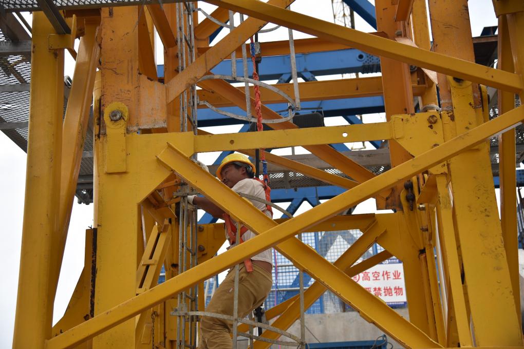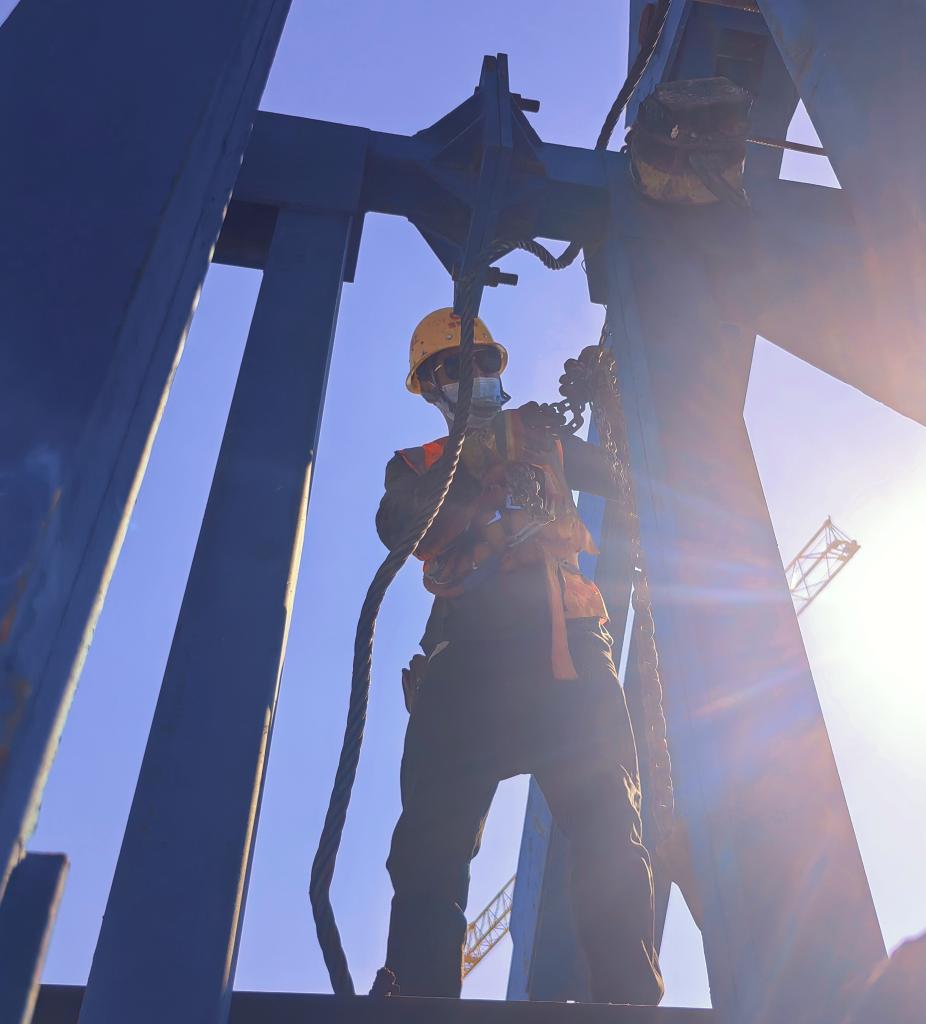 身处高空,记者内心无比紧张。而一旁的马海扯坡和工友们则显得比较轻松,正有条不紊地在塔顶安装门架,为即将开展的高空大重量吊装做准备。