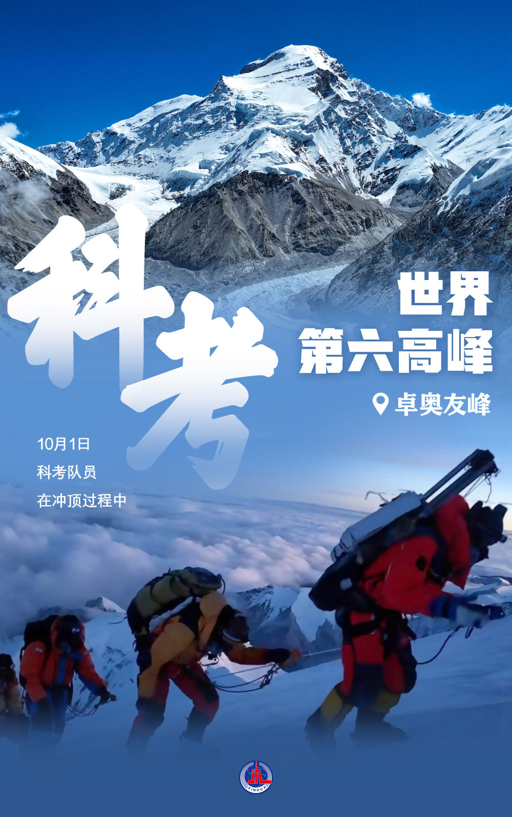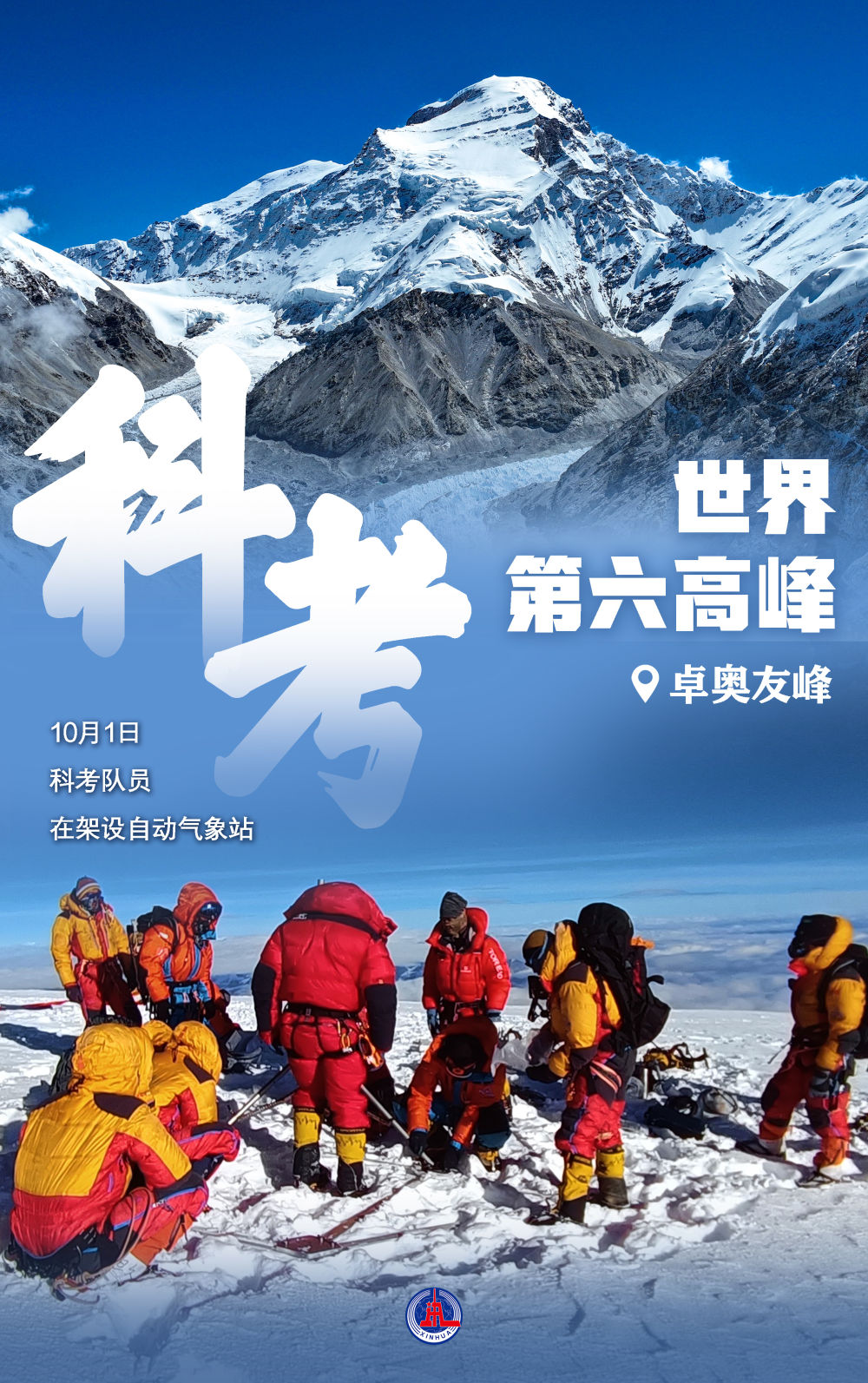 10月1日上午9时15分,我国18名科考队员成功登顶世界第六高峰卓奥友峰,开展极高海拔自动气象站架设、峰顶冰雪测厚、冰芯钻取及雪冰样品采集等多项科考任务。这是我国科考队首次登顶珠峰以外的海拔8000米以上高峰。