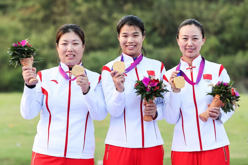 10月1日,中国选手李清念(右)、武翠翠(左)、张鑫秋在颁奖仪式上。新华社记者 单宇琦 摄