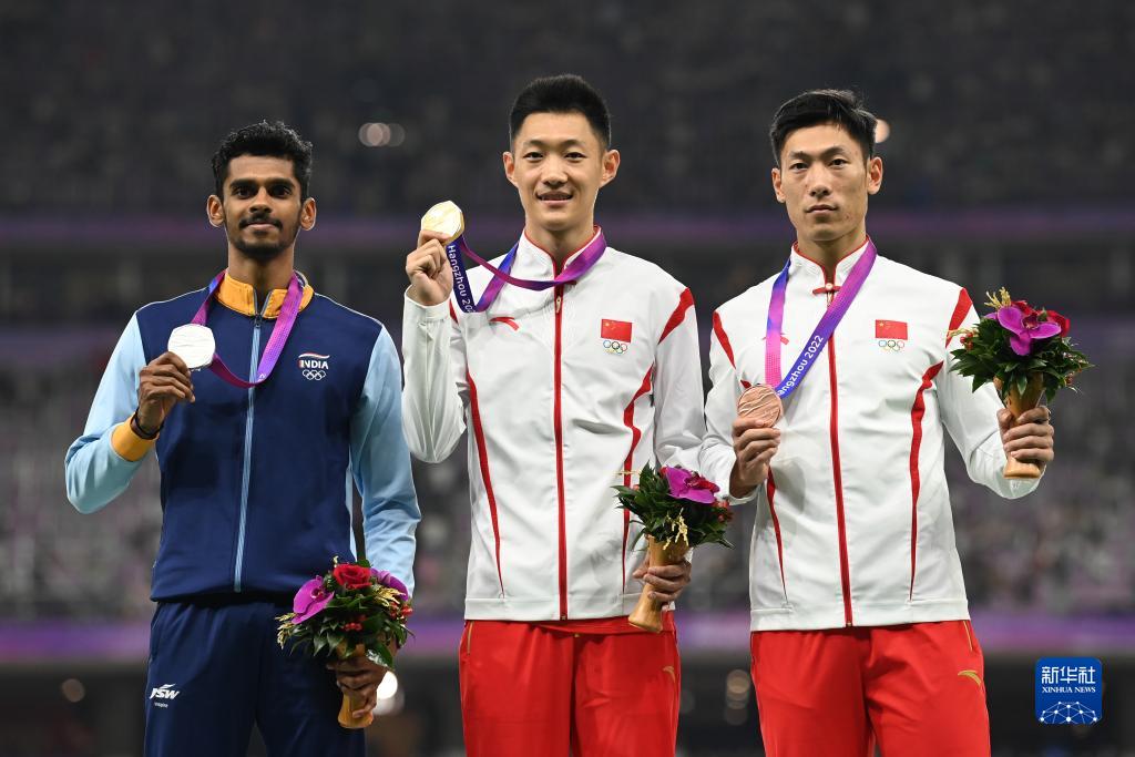 10月1日,冠军中国选手王嘉男(中),亚军印度选手斯里尚卡尔(左)和季军中国选手石雨豪在颁奖仪式上。
