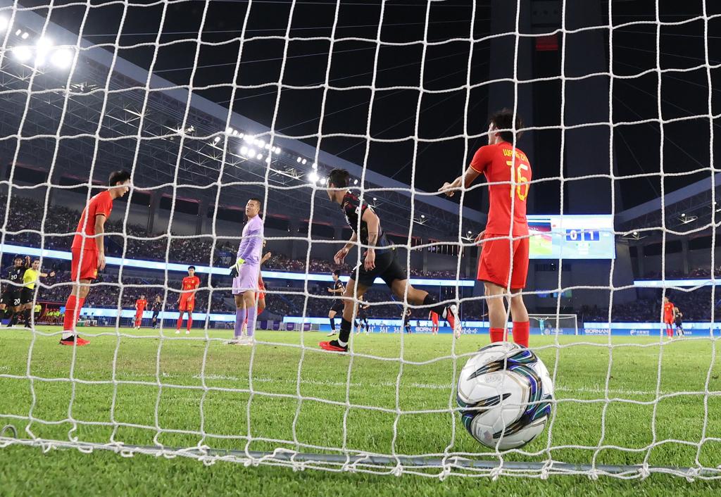 上半场尾声阶段,没有放弃的中国队终于觅得了全场最有威胁的一次进攻,陶强龙前场形成抢断,并在禁区边上兜传后点,后点插上的戴伟浚将皮球顶在了门柱上,中国队遗憾错失缩小分差的机会。