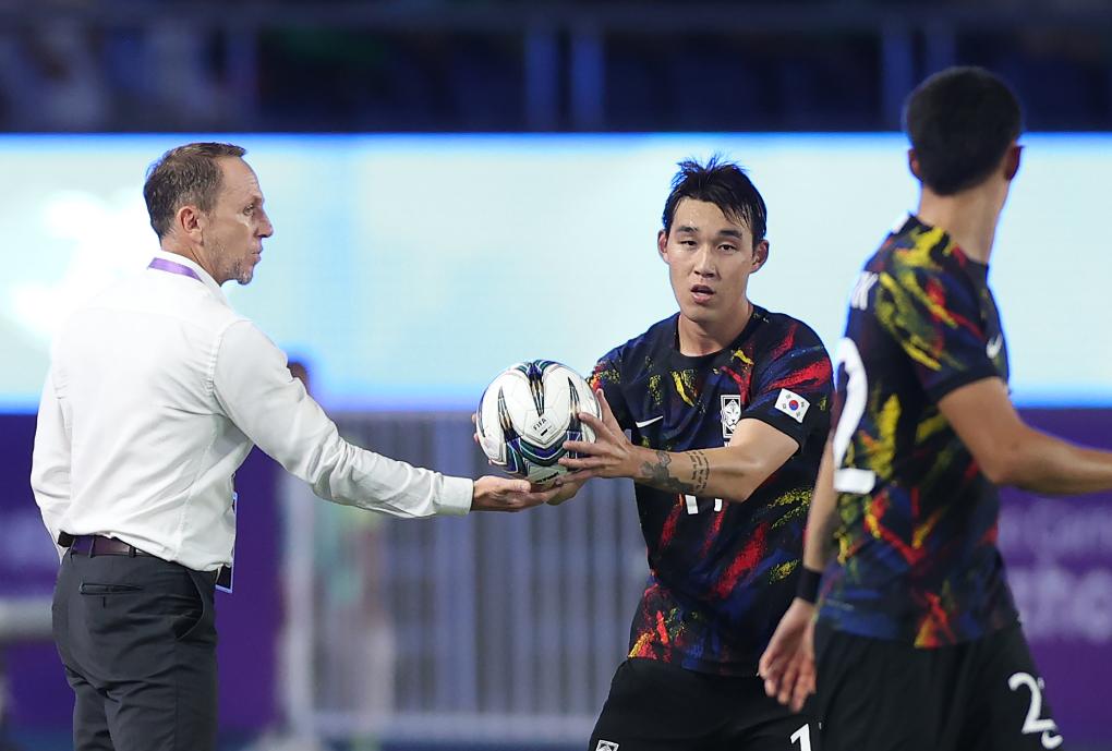 10月1日,中国队主教练久尔杰维奇(左)在比赛中将球交给韩国队球员。新华社记者 贾浩成 摄