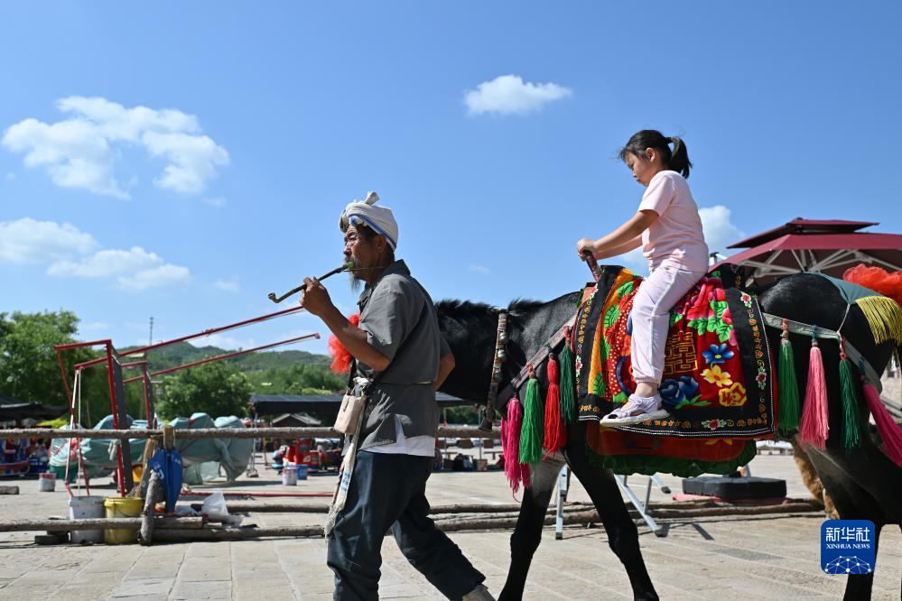 村民李永林拉着毛驴在古镇行走(8月2日摄)。李永林在村里的16亩地上种小麦、玉米和土豆,农闲时把他的毛驴打扮一新,在景区供游客骑乘。