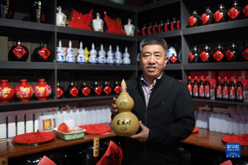 在山西碛口古镇,张海龙在展示醋产品(9月26日摄)。张海龙之前是卡车司机,2018年,他在碛口古镇开了一家山西陈醋店,吸引不少游客光顾。
