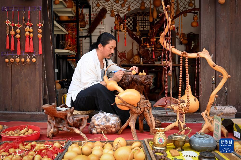 在山西碛口古镇,闫强强在制作葫芦工艺品(8月2日摄)。闫强强之前在天津打工,干过汽车维修,摆过地摊。2016年,掌握了葫芦烫画工艺的闫强强在碛口古镇开了一家文创店,靠着卖文创葫芦,一年收入超过10万元。