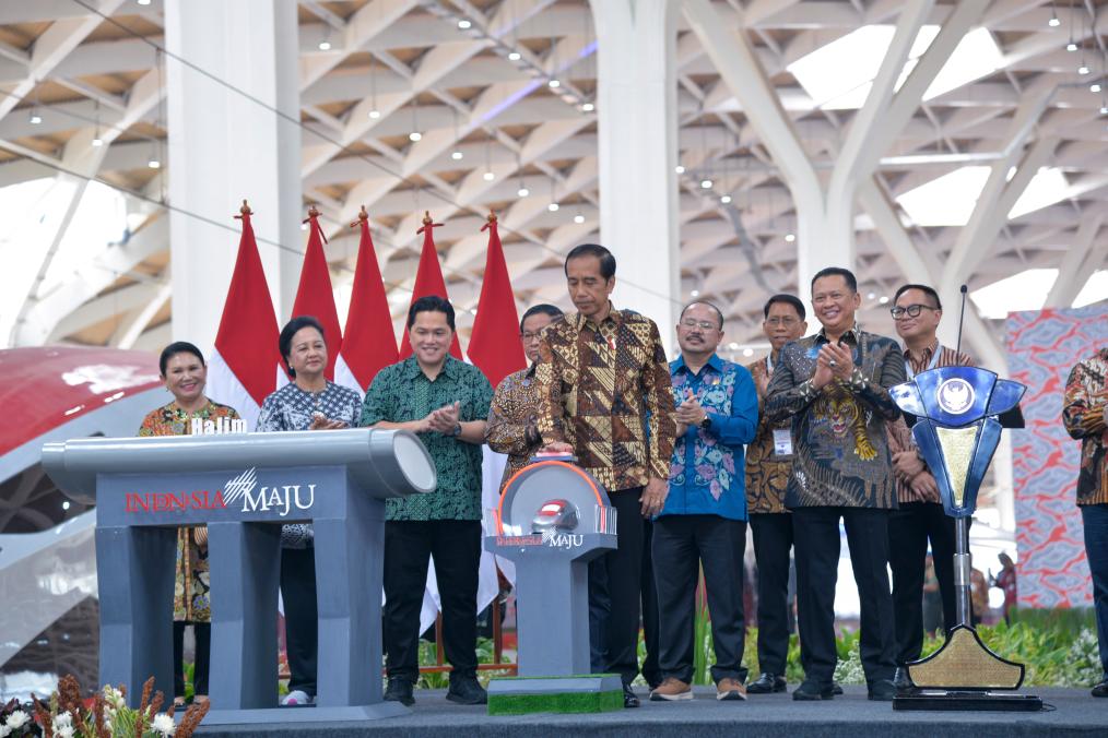 10月2日,在印度尼西亚雅加达哈利姆高铁站,印尼总统佐科(前)在雅万高铁启用仪式上按下启用键。新华社记者徐钦摄