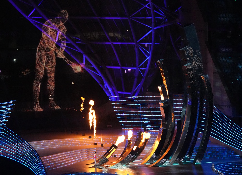 9月23日,火炬手汪顺和数字火炬手在杭州亚运会开幕式上共同点燃主火炬。新华社记者 江文耀 摄