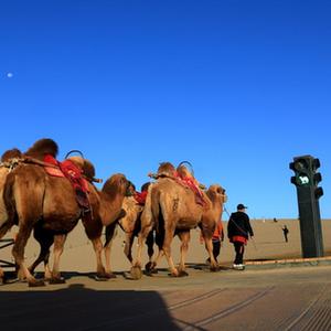 10月2日,甘肃省敦煌市鸣沙山月牙泉景区的交通信号灯“骆驼绿灯”亮时,农户牵着骆驼有序通过。