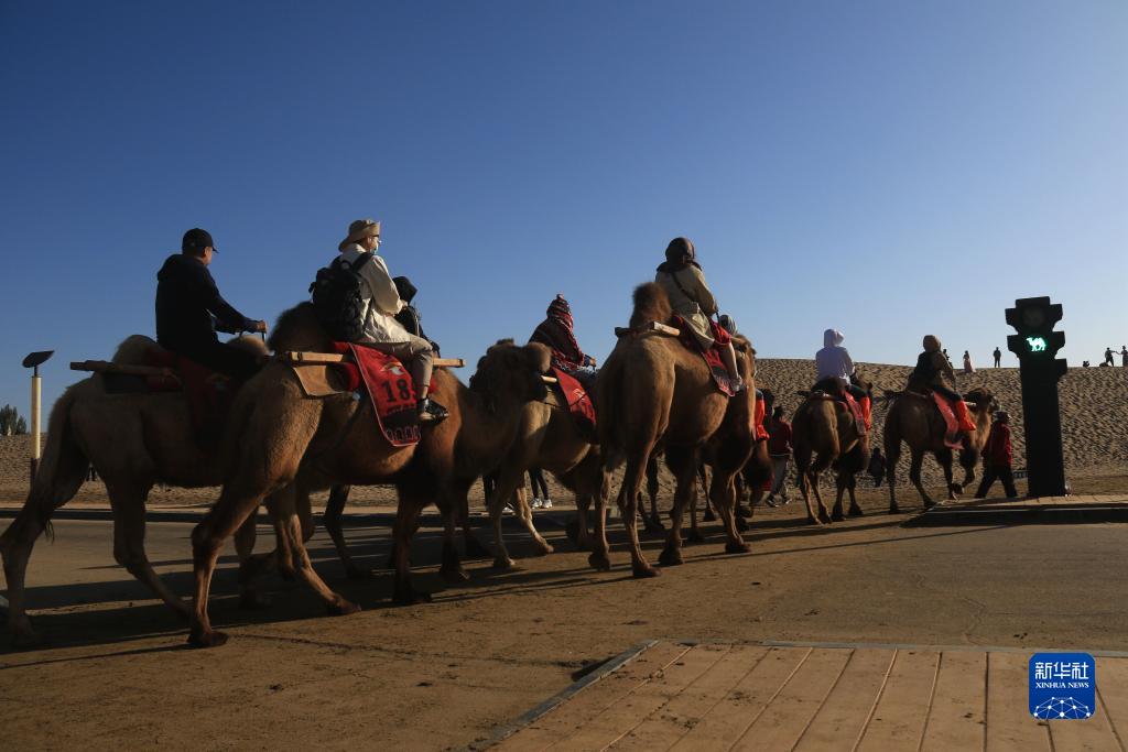 中秋、国庆假期期间,甘肃省敦煌市鸣沙山月牙泉景区迎来旅游高峰。设置在景区内行人步道和骆驼通道交叉点的交通信号灯“骆驼红绿灯”引导人、车和骆驼有序通行,确保了景区交通安全畅通。