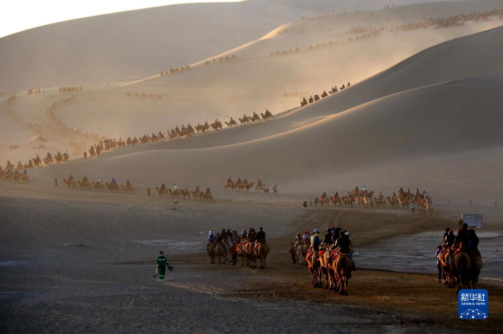 10月2日,游客在甘肃省敦煌市鸣沙山月牙泉景区体验骑骆驼。