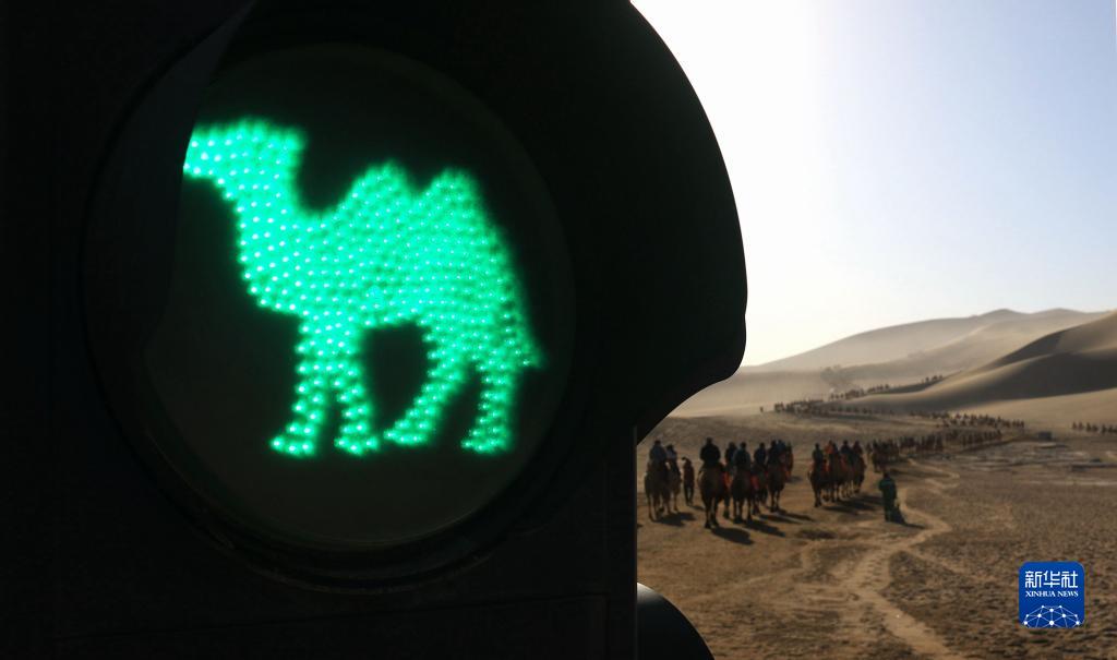 中秋、国庆假期期间,甘肃省敦煌市鸣沙山月牙泉景区迎来旅游高峰。设置在景区内行人步道和骆驼通道交叉点的交通信号灯“骆驼红绿灯”引导人、车和骆驼有序通行,确保了景区交通安全畅通。