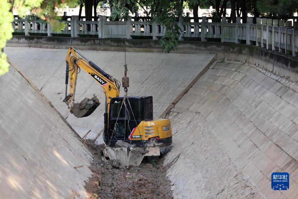 工作人员在大禹渡扬水工程驾驶挖掘机清淤(9月21日摄)。