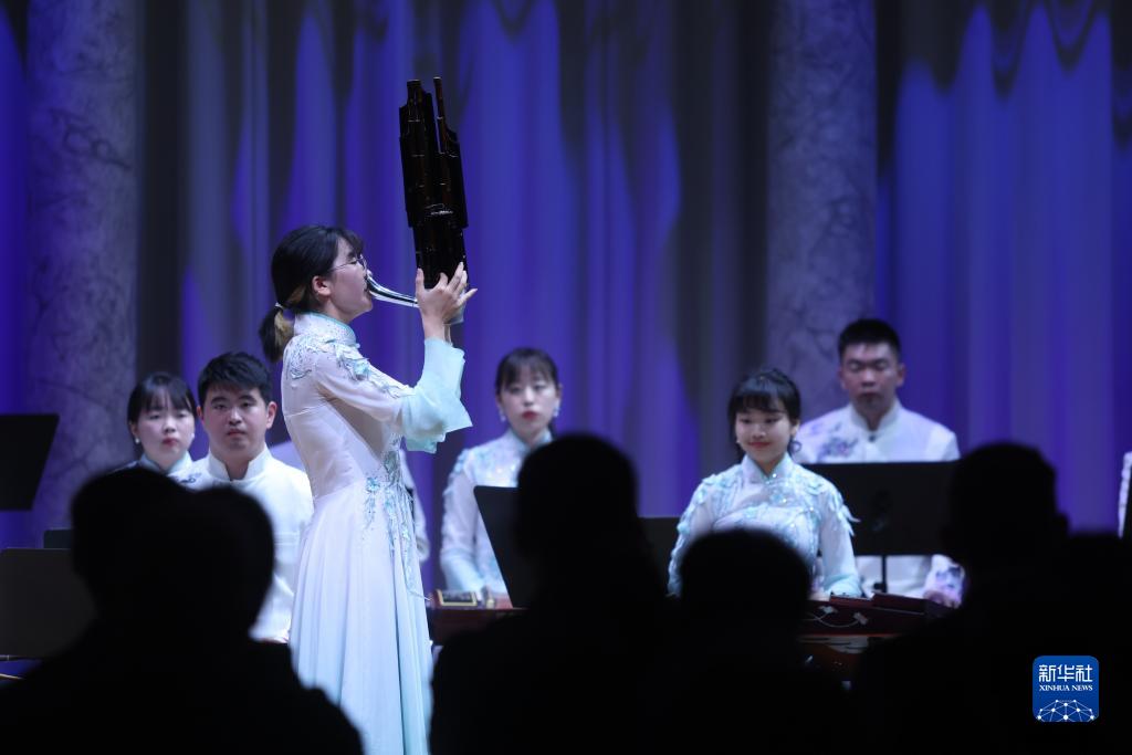 10月2日,在斯洛文尼亚卢布尔雅那的卢布尔雅那大学音乐学院,南京大学民族乐团成员表演笙独奏。