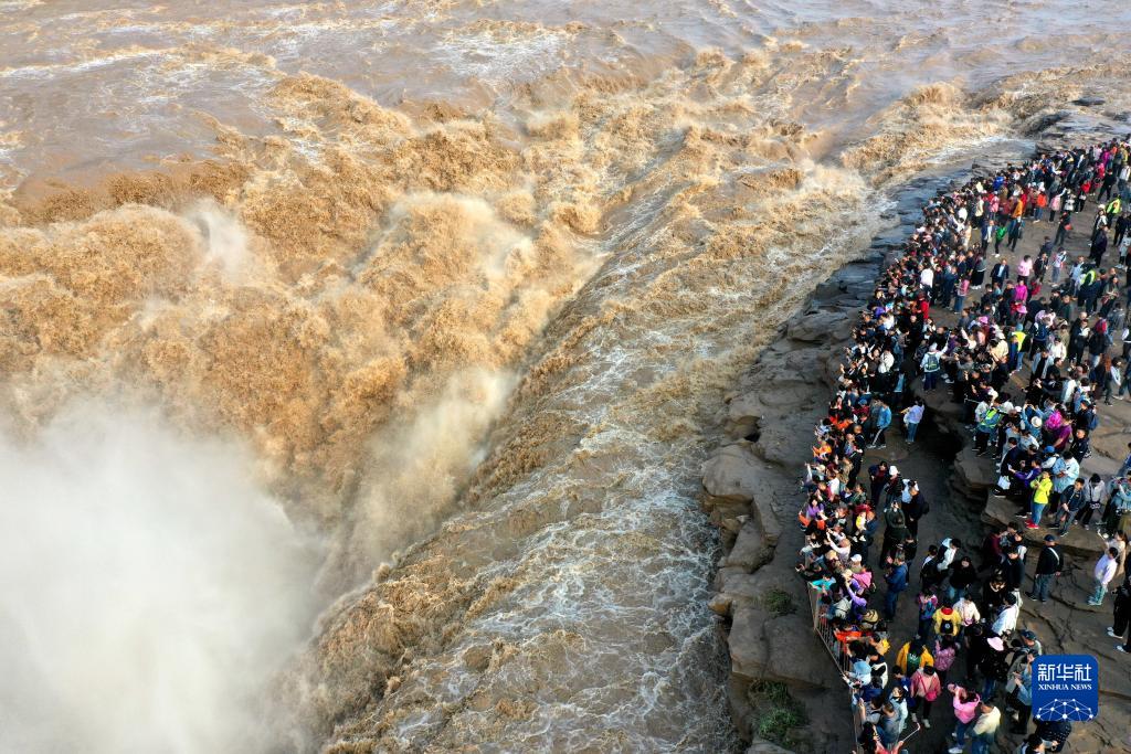 10月3日,游客在黄河壶口瀑布景区游览(无人机照片)。