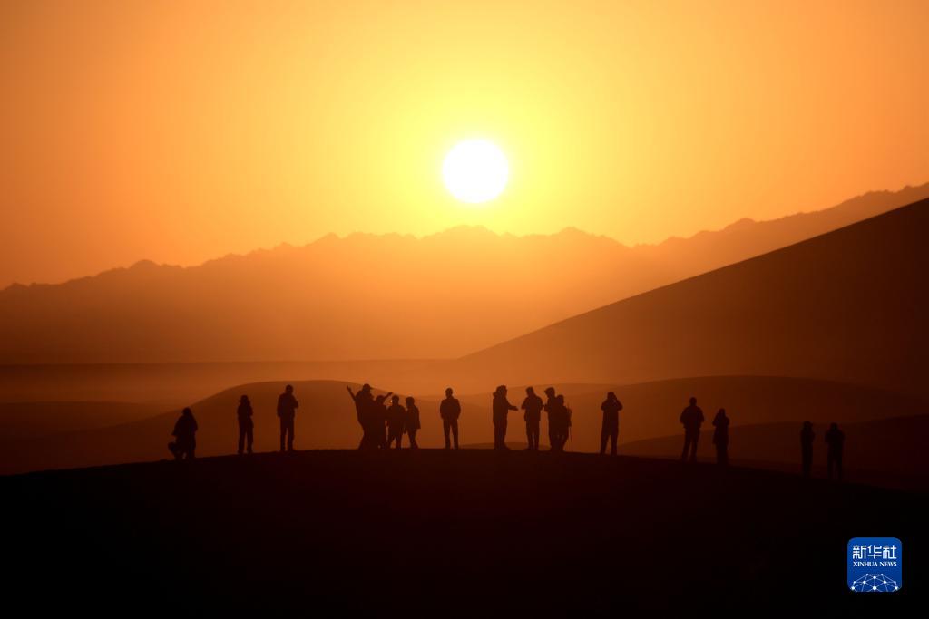 10月2日清晨,游客在甘肃省敦煌市鸣沙山月牙泉景区观赏日出。