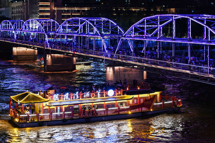 游客乘船穿过兰州黄河铁桥——中山桥。新华社记者 范培珅 摄