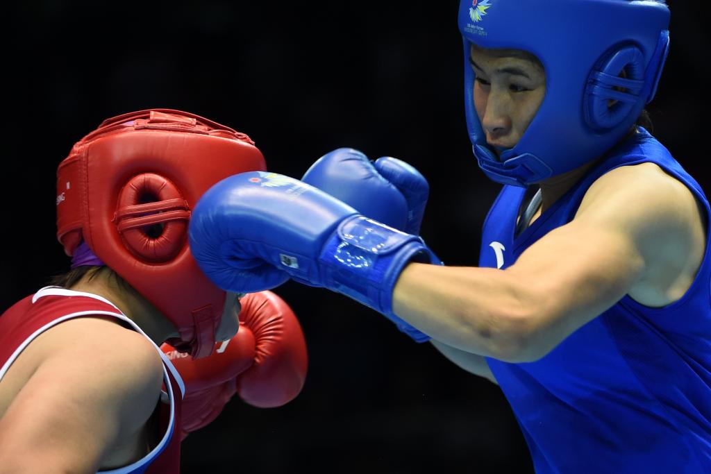 2014年10月1日,在仁川亚运会女子拳击75公斤级决赛中,李倩(右)以1:2负于朝鲜选手姜恩惠,获得亚军。新华社记者高健钧摄