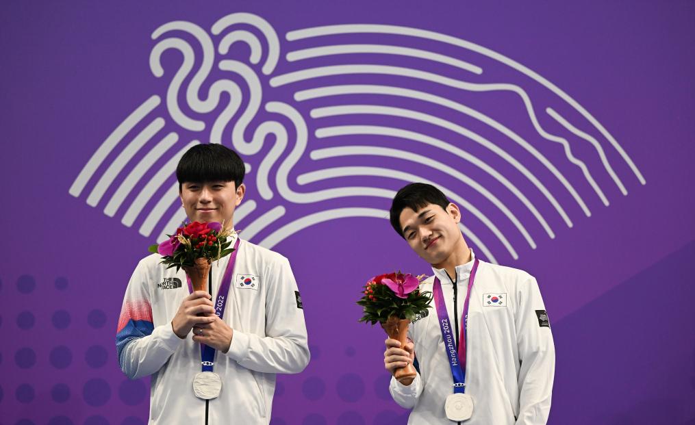 10月1日,在杭州亚运会男子双人10米跳台决赛中,韩国组合李在炅(左)/金荣南获得亚军。新华社记者 夏一方 摄