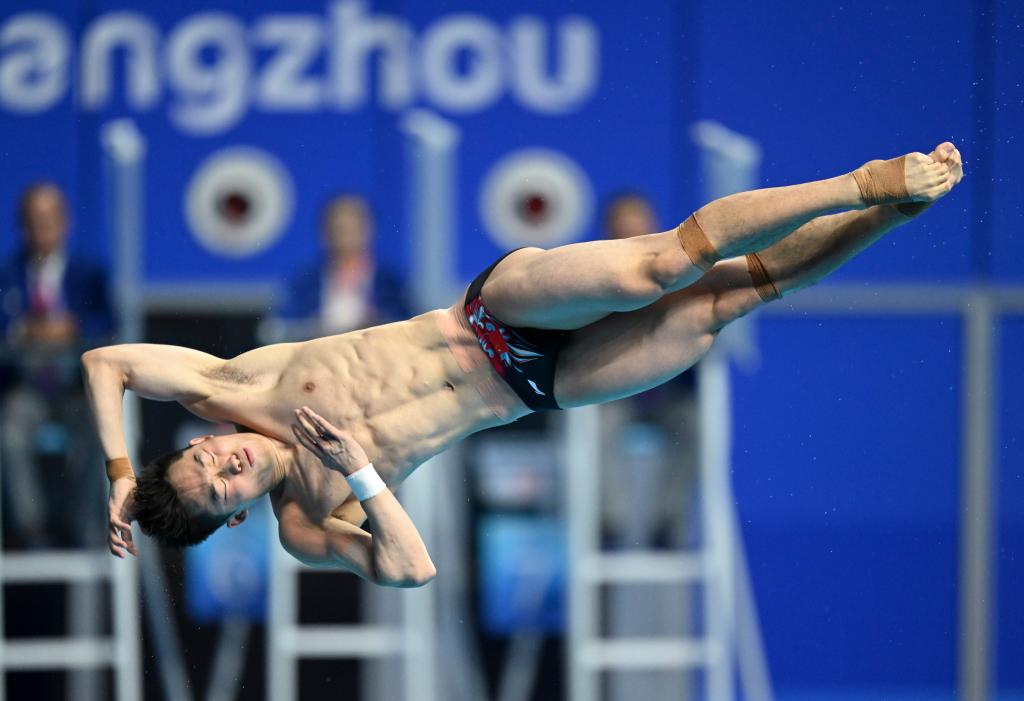 10月3日,在杭州亚运会男子3米跳板决赛中,王宗源以542.30分获得冠军。新华社记者 薛宇舸 摄