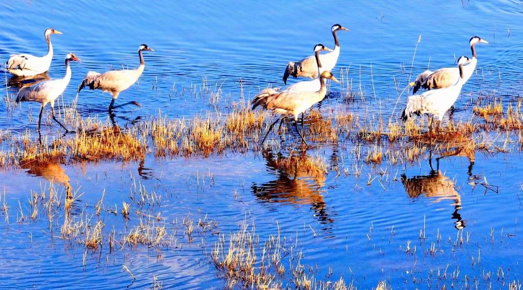 今年三月,即将北上的灰鹤在平罗县河谷觅食。(受访者供图)