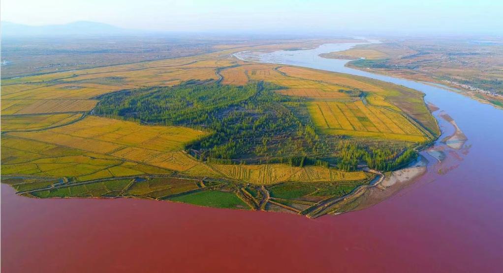 金秋傍晚,岳昌鸿无人机镜头下的宁夏平罗县头闸河湾。(受访者供图)