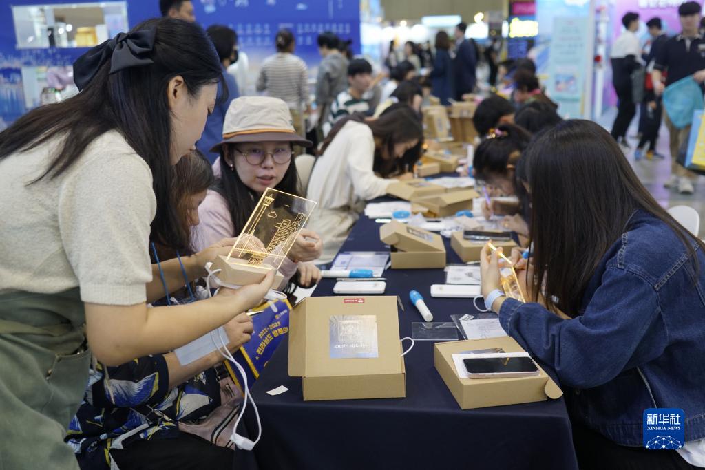 10月5日,人们在韩国釜山国际旅游展上制作手工。新华社记者 陆睿 摄