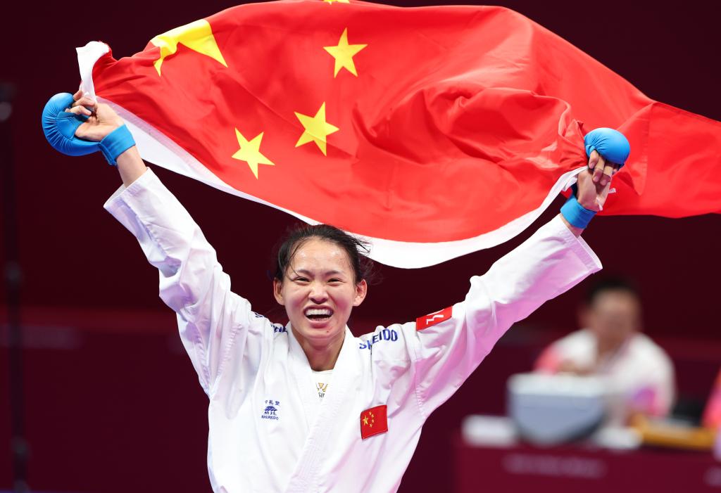 当日,在杭州亚运会空手道项目女子组手68公斤级比赛中,中国选手李巧巧获得冠军,哈萨克斯坦选手劳拉·阿利库尔获得亚军,越南选手丁氏香和巴勒斯坦选手哈拉·卡迪获得第三名。新华社记者 程婷婷 摄