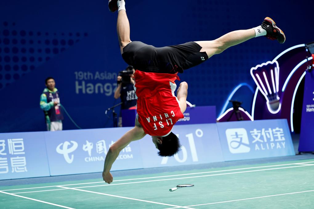当日,在杭州亚运会羽毛球男子单打四分之一决赛中,中国选手李诗沣以2比0战胜印度尼西亚选手安东尼·西尼苏卡·金廷,晋级半决赛。新华社记者 任正来 摄