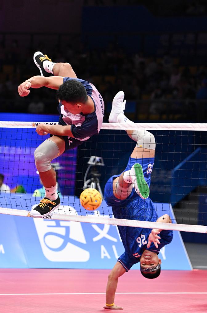 当日,在浙江省金华市金华体育中心体育馆举行的杭州亚运会藤球男子单组预选赛中,泰国队以2比0战胜印度队。新华社记者 陈钟昊 摄
