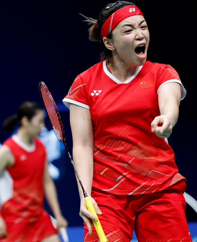 当日,在杭州亚运会羽毛球女子双打四分之一决赛中,中国组合陈清晨/贾一凡以2比0战胜日本组合松山奈未/志田千阳,晋级半决赛。新华社记者 任正来 摄