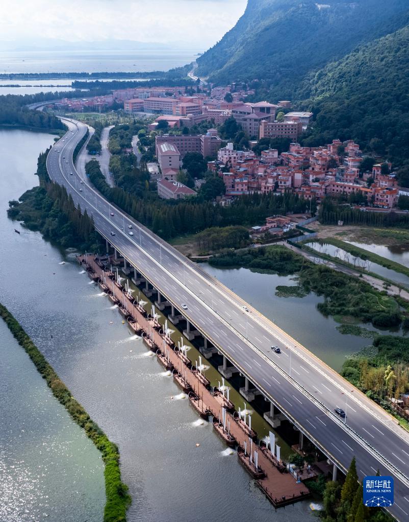 这是10月6日拍摄的位于高速公路桥下的滇池绿道草海段钢浮桥(无人机照片)。