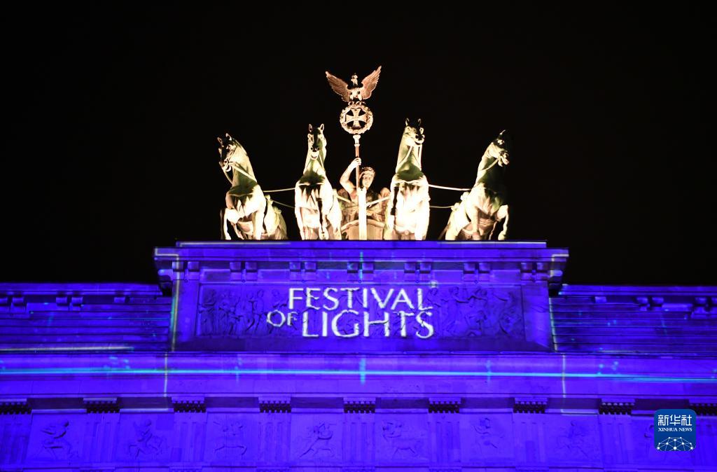 10月6日,德国柏林勃兰登堡门被灯光点亮。