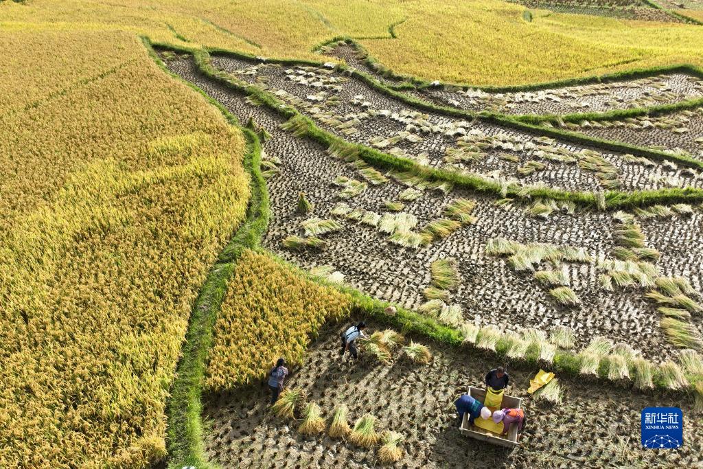 10月7日,农民在云南腾冲市腾越街道上勐连社区收获稻谷(无人机照片)。