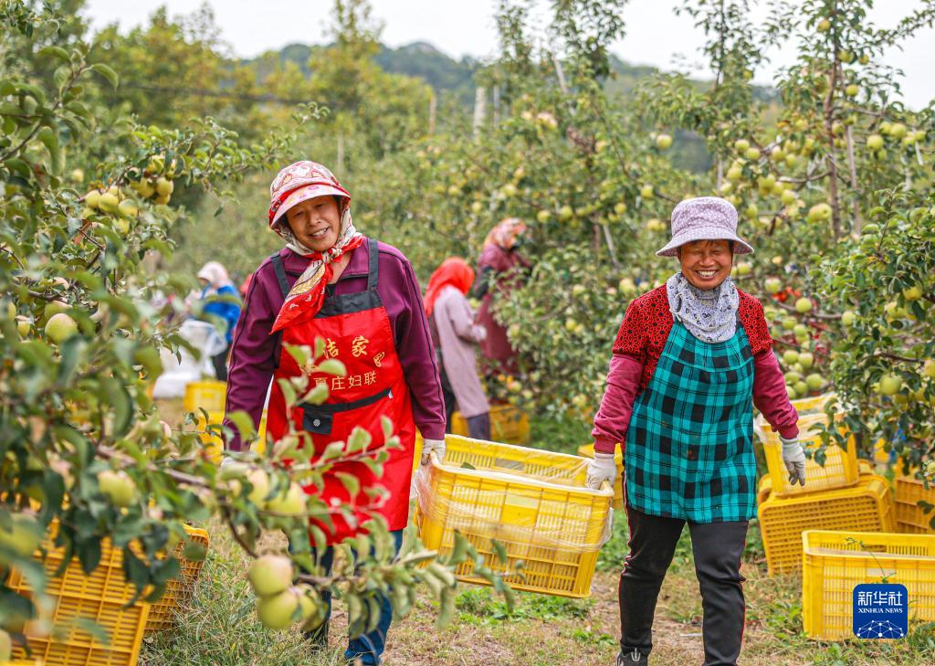 10月7日,在山东省荣成市俚岛镇花园谷一处苹果园内,果农在采摘、分拣、装运苹果。