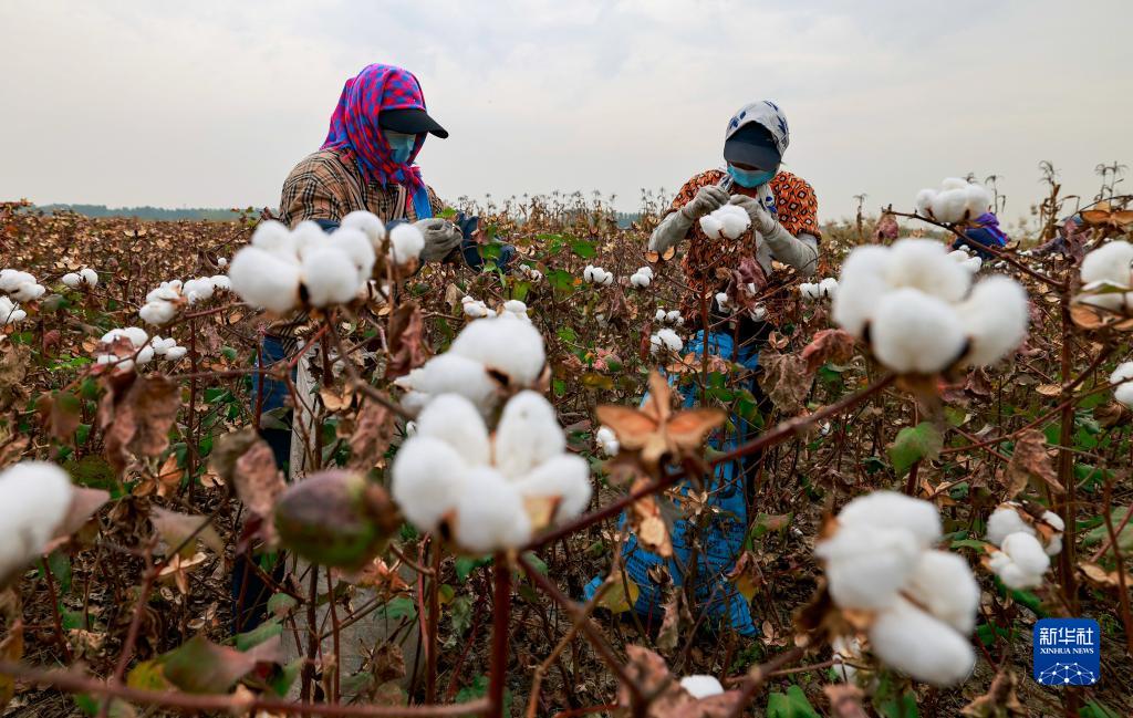 10月7日,河北省唐山市丰南区东田庄乡刘大官村的农民在田间采收棉花。