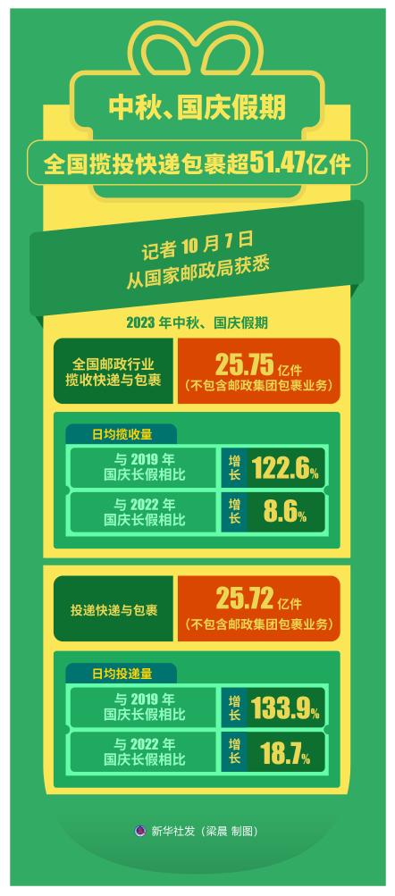 新华社北京10月7日电(记者戴小河)记者7日从国家邮政局获悉,今年中秋、国庆假期全国邮政行业揽收快递与包裹25.75亿件(不包含邮政集团包裹业务),日均揽收量与2019年国庆长假相比增长122.6%,与2022年国庆长假相比增长8.6%;投递快递与包裹25.72亿件(不包含邮政集团包裹业务),日均投递量与2019年国庆长假相比增长133.9%,与2022年国庆长假相比增长18.7%。