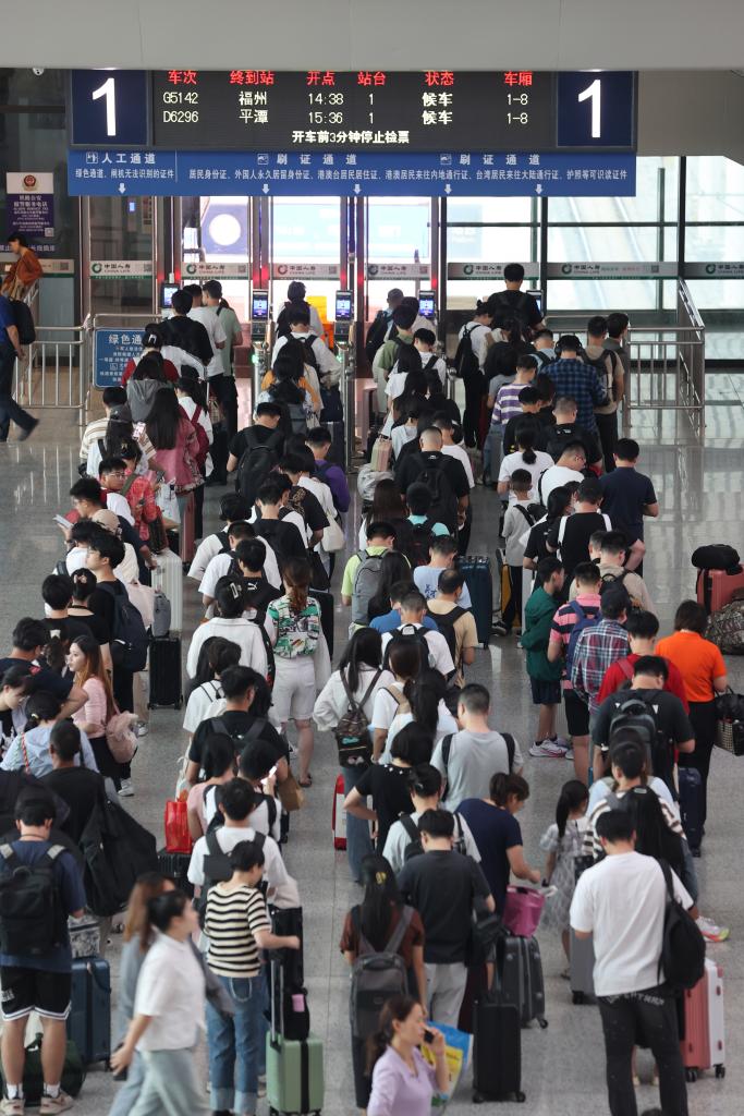 10月6日,旅客在福建厦门火车站候车大厅排队等候上车。新华社发(曾德猛 摄)