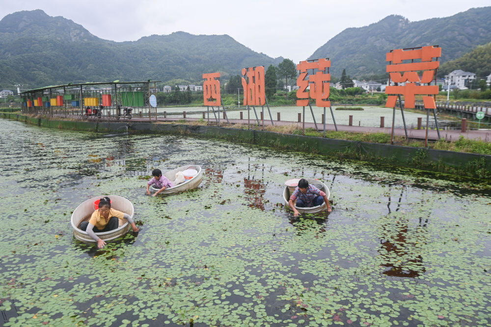 9月5日,在浙江省建德市航头镇乌龙村莼菜基地,村民划着“盆船”在西湖莼菜产业园种植基地的水面上采摘西湖莼菜。近年来,浙江建德市航头镇以党建联建为纽带,围绕辖区特色农业产业园建设,发挥新乡贤、乡土人才、农创客作用,在乌龙村投资600余万元新建了占地1900平方米的西湖莼菜产业园,引导新乡贤争当农业致富带头人,打造西湖莼菜共富工坊。新华社记者 徐昱 摄