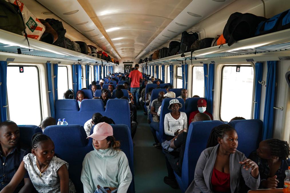 9月20日,在肯尼亚蒙内铁路内罗毕站,乘客坐在即将开往蒙巴萨的客运列车车厢内。新华社记者韩旭摄